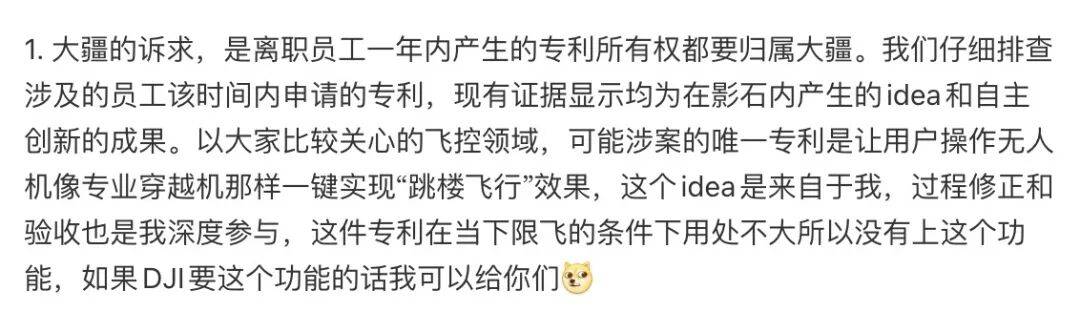 但关键问题在于,这一表述回避了几个更核心的判断点:是否有离职未满一年的前大疆员工参与相关专利形成?参与程度如何?这些专利,与其在大疆时期的工作内容,关联度究竟多高?