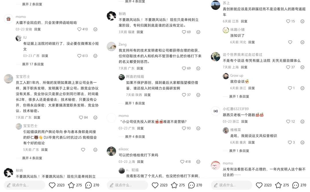 有网友直言,“本来是不想支持大疆的,但是看了长文后,立场反而变了”;也有人质疑,影石市值都 700 亿了,面对严肃的侵权指控,竟然用不严肃的“小作文”来回应;甚至一向被视为影石“后花园”的小红书,也出现了不少批评的声音。